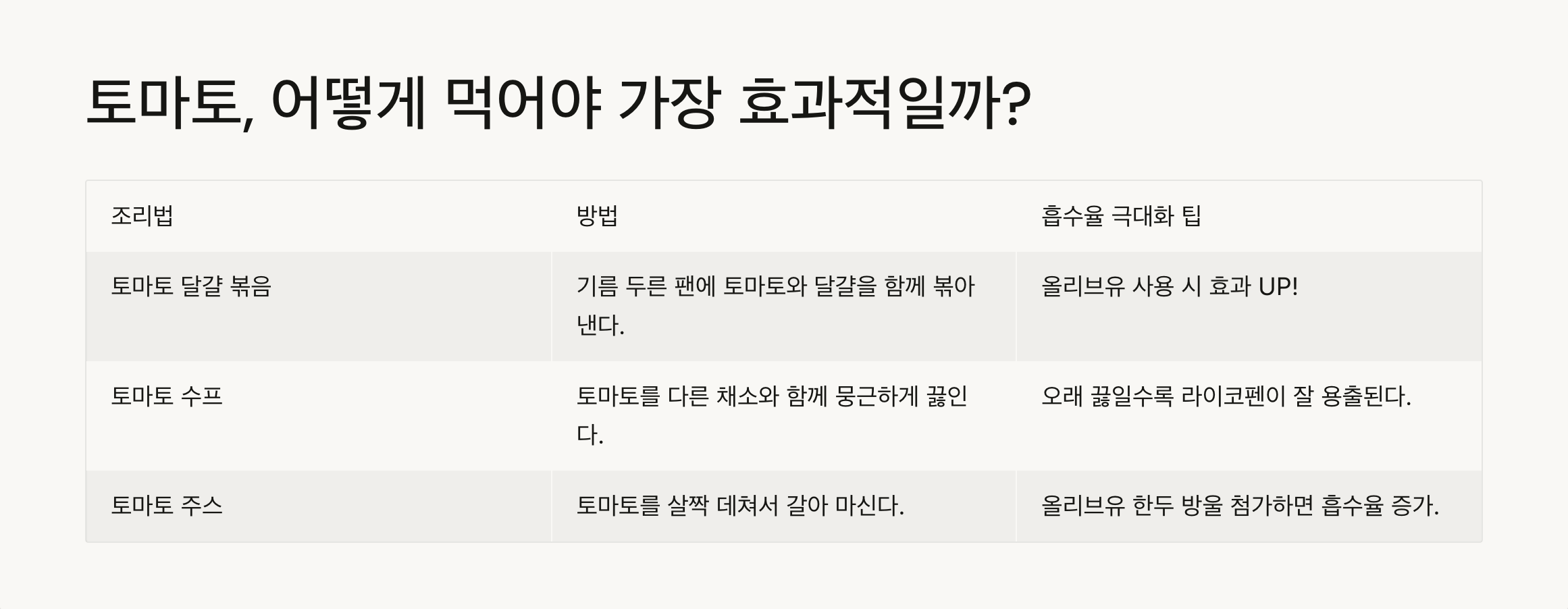 | 섭취 형태 | 라이코펜 함량 (상대적) | 체내 흡수율 |