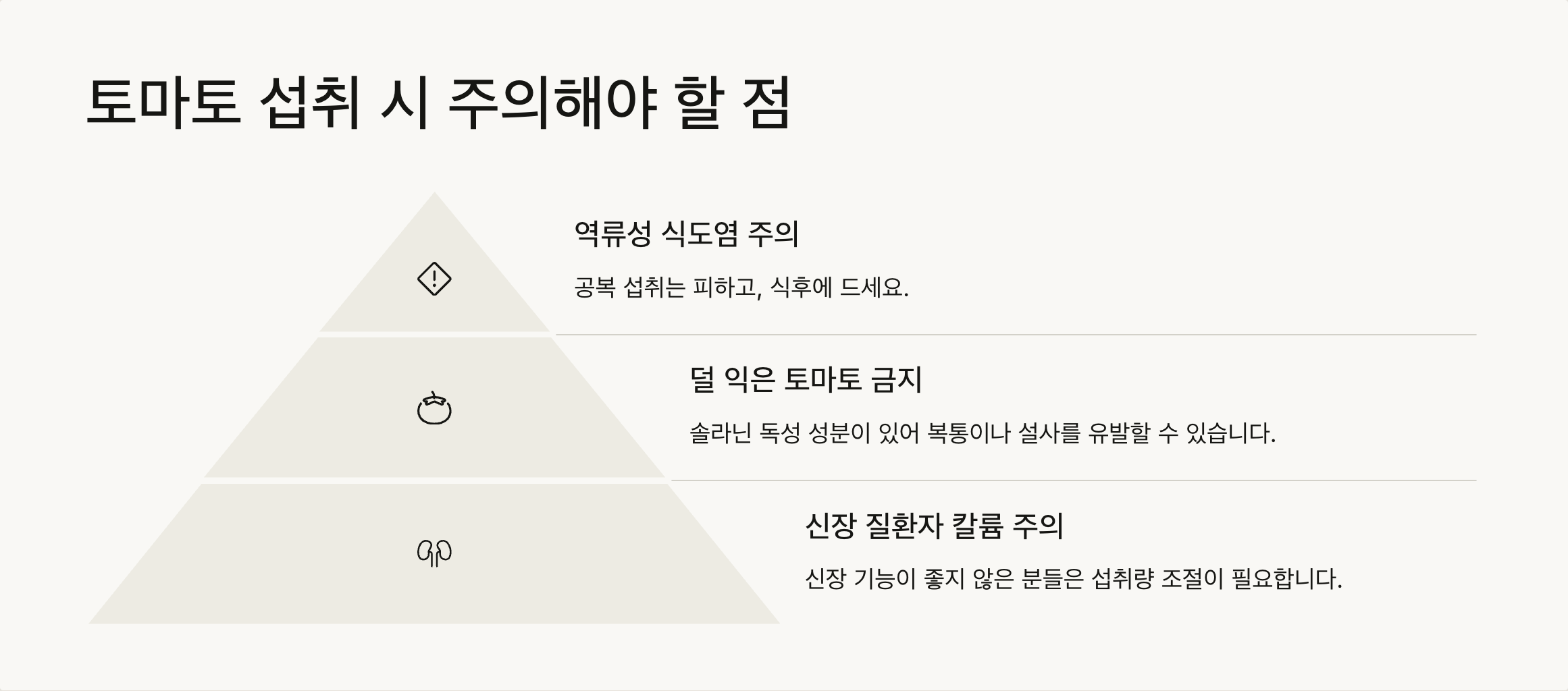 - 역류성 식도염 환자 주의: 토마토의 산 성분이 위산을 과도하게 분비시켜 속 쓰림 증상을 악화시킬 수 있습니다. 공복 섭취는 피하고, 식후에 드시는 것이 좋습니다.