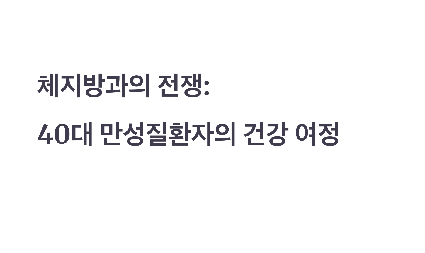 젊었을 땐 저도 그냥 '보기 좋은 몸' 정도만 생각했어요. 근데 있잖아요, 당뇨, 고혈압, 고지혈증 같은 만성질환 진단을 받고 나니까 체지방이 단순히 겉모습의 문제가 아니더라고요. 이건 정말 생존의 문제였어요. 의사 선생님이 체지방 1kg을 빼는 게 혈압약을 먹는 것보다 중요할 수 있다고 하시는데, 머리를 한 대 맞은 것 같았죠. 내장지방은 우리 몸속에서 염증을 일으키는 시한폭탄과 같아요. 혈관을 망가트리고, 인슐린 저항성을 높여서 당뇨를 악화시키죠. 그래서 전 생존을 위해 체지방과 전쟁을 시작했습니다. 여러분은 저처럼 건강을 잃고 나서 후회하지 않으셨으면 좋겠어요.