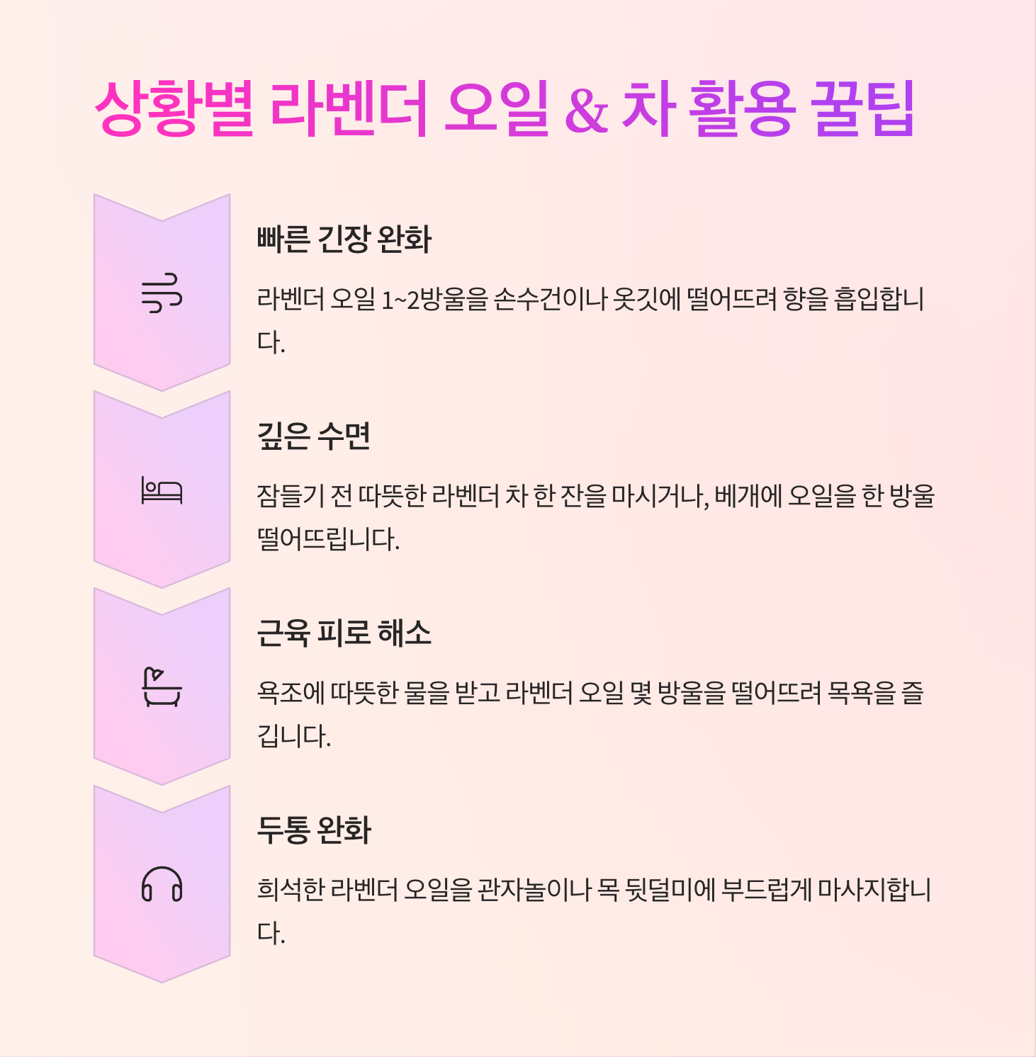 | 깊은 수면을 원할 때 | 잠들기 전 따뜻한 라벤더 차 한 잔을 마시거나, 베개에 오일을 한 방울 떨어뜨립니다. |