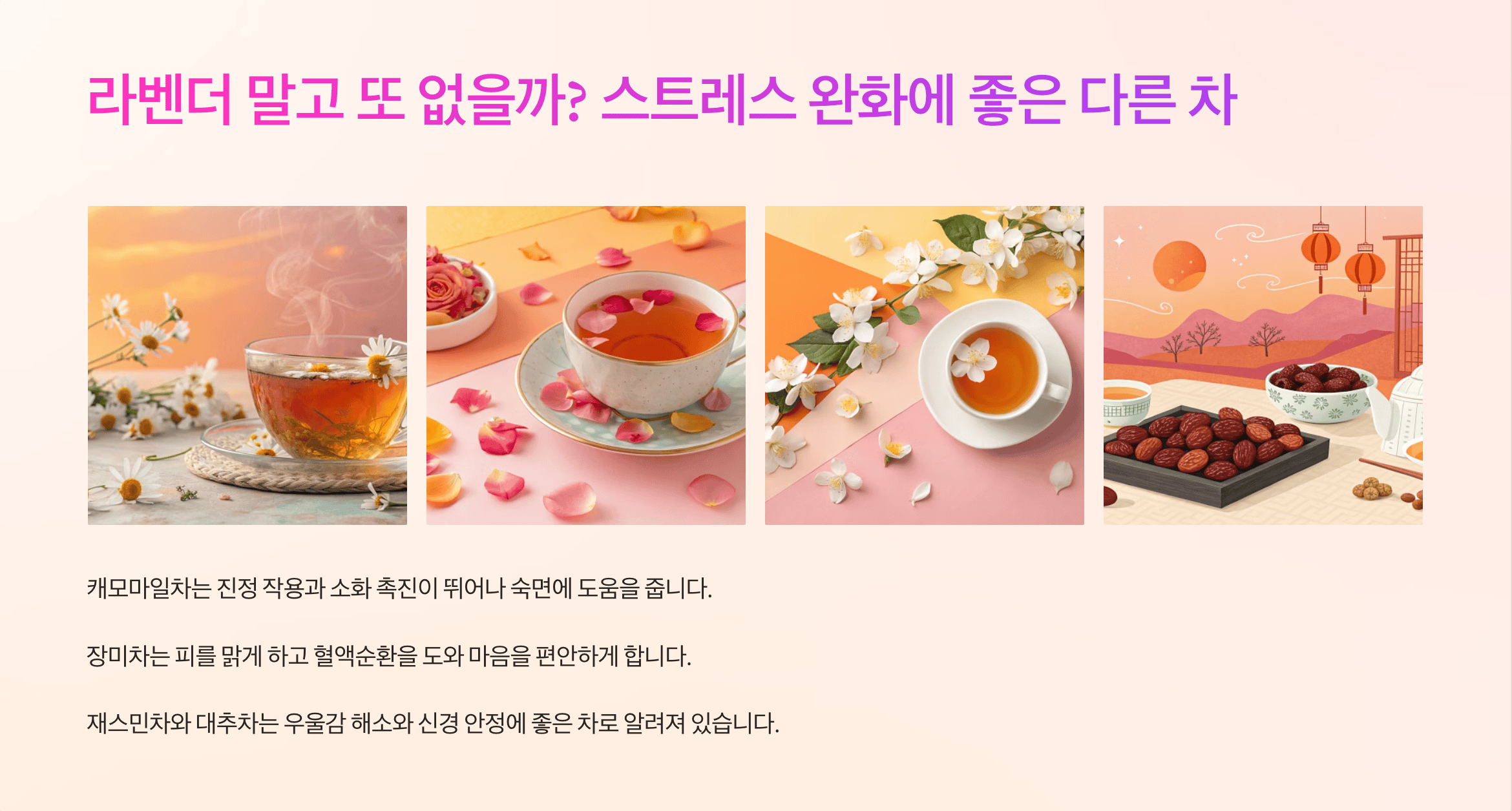 라벤더 외에도 스트레스 완화에 도움을 주는 다양한 허브차들이 있습니다. 취향에 맞게 선택하여 즐겨보세요. 캐모마일차는 진정 작용과 소화 촉진이 뛰어나 숙면에 도움을 주며, 장미차는 피를 맑게 하고 혈액순환을 도와 마음을 편안하게 합니다. 또한 재스민차나 대추차 역시 우울감 해소와 신경 안정에 좋은 차로 알려져 있습니다.