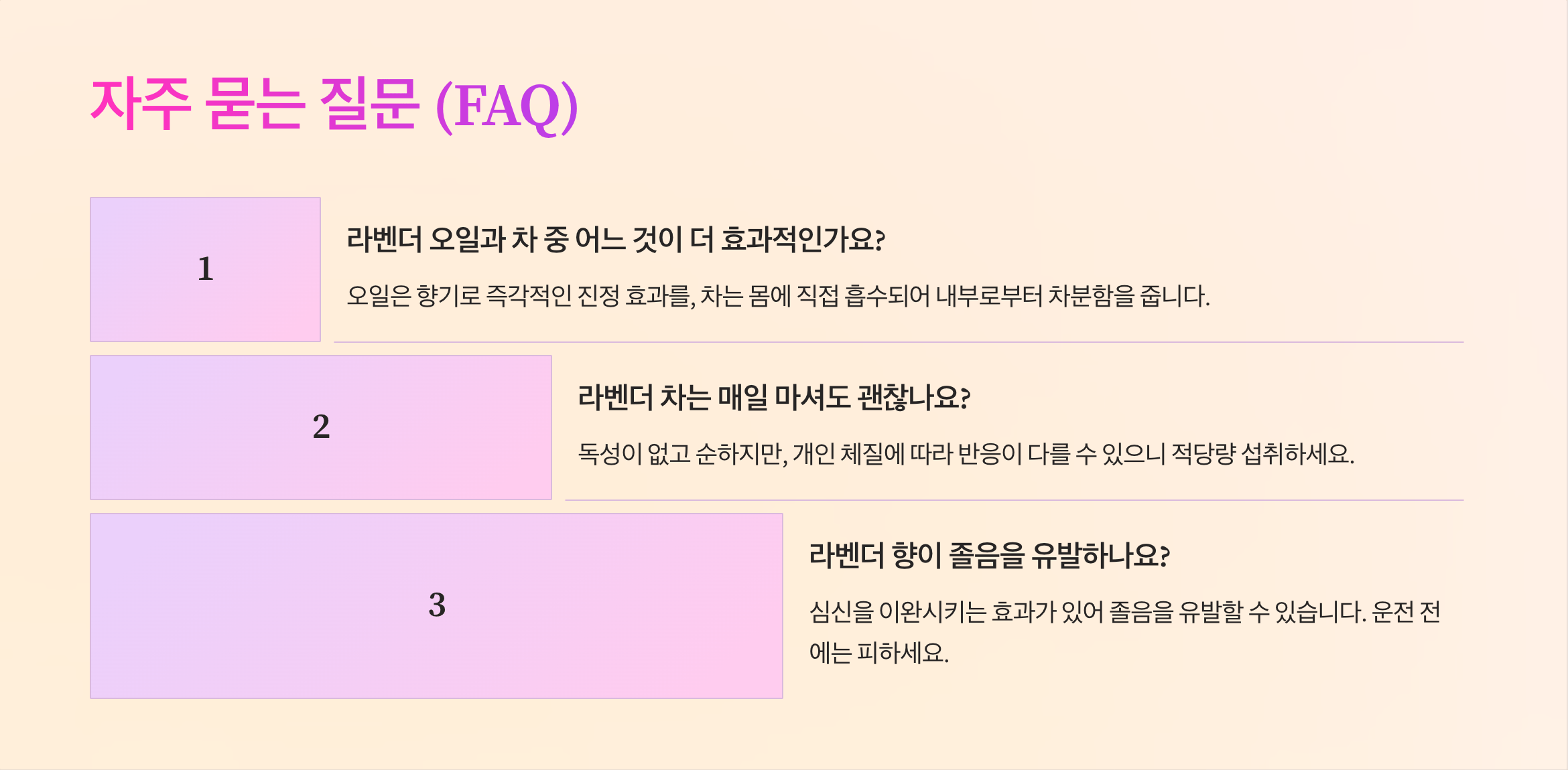 지금까지 라벤더 오일과 차가 가진 놀라운 스트레스 완화 효과에 대해 자세히 알아보았습니다. 향기로운 오일 한 방울, 따뜻한 차 한 잔이 지친 몸과 마음에 얼마나 큰 위로와 휴식을 줄 수 있는지 새삼 느끼게 됩니다. 라벤더는 단순히 향기 좋은 식물을 넘어, 과학적으로도 그 효능이 입증된 훌륭한 자연 요법입니다. 오늘부터라도 라벤더를 일상에 가까이 두고, 스트레스는 덜고 평온함은 더하는 건강한 날들을 만들어 가시는 건 어떨까요? 여러분의 편안한 밤과 활기찬 낮을 응원합니다.