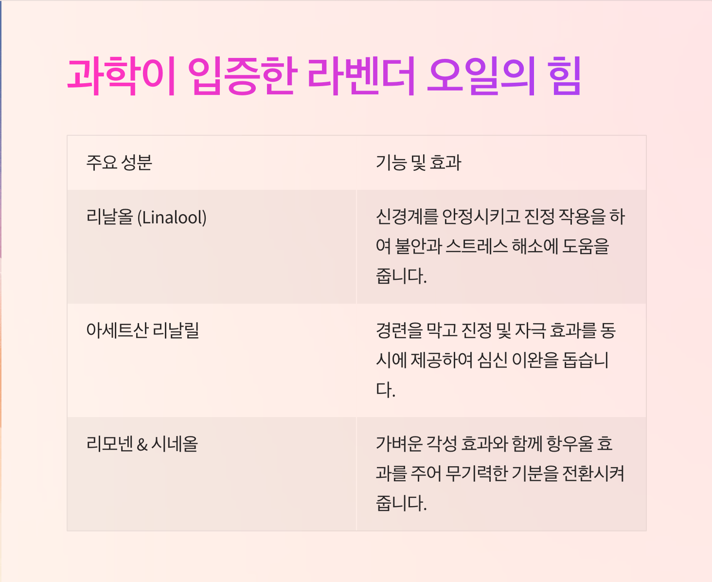 | 리날올 (Linalool) | 신경계를 안정시키고 진정 작용을 하여 불안과 스트레스 해소에 도움을 줍니다. |