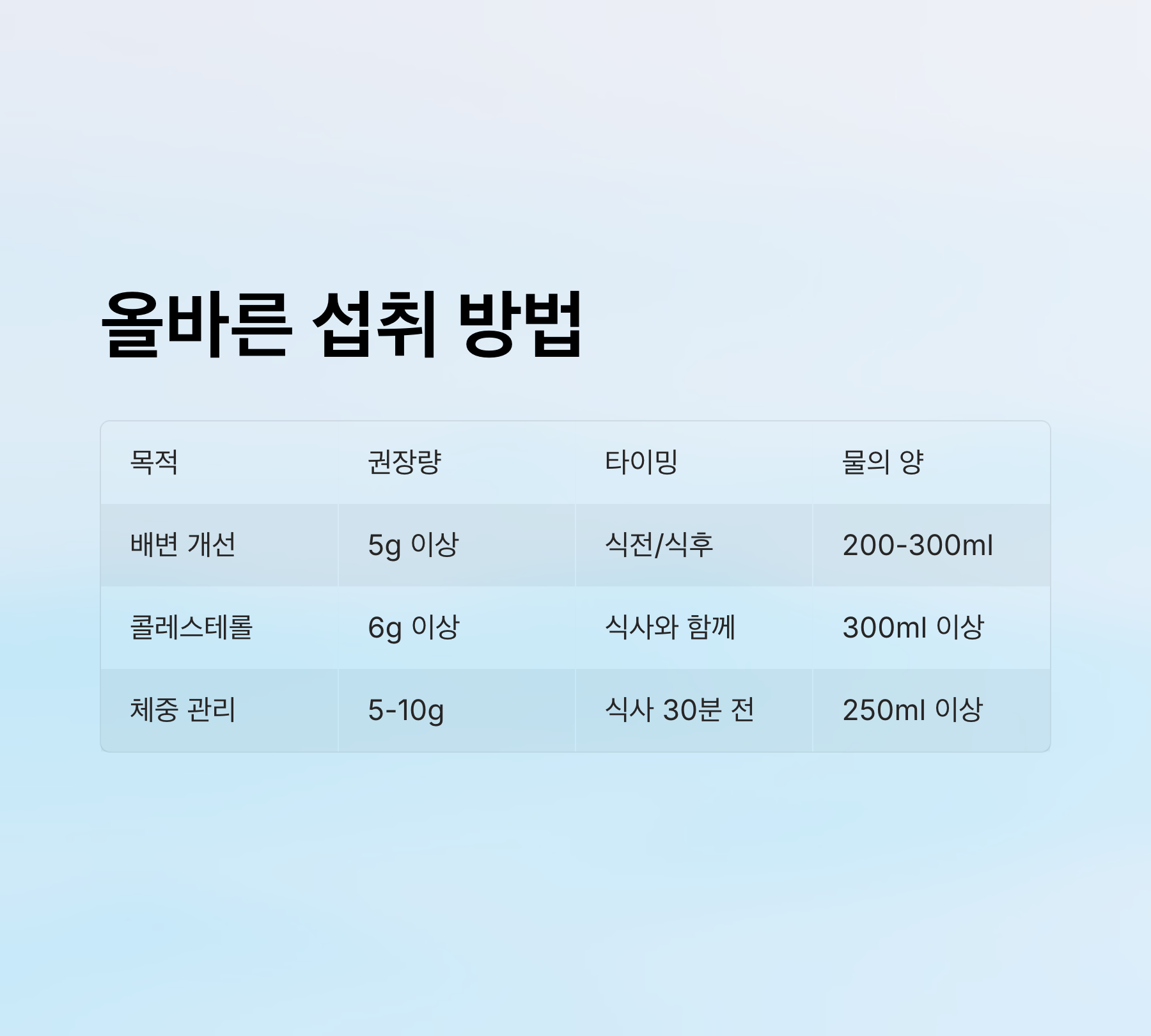 | 혈중 콜레스테롤 개선 | 6g 이상 | 식사와 함께 | 300ml 이상 |
