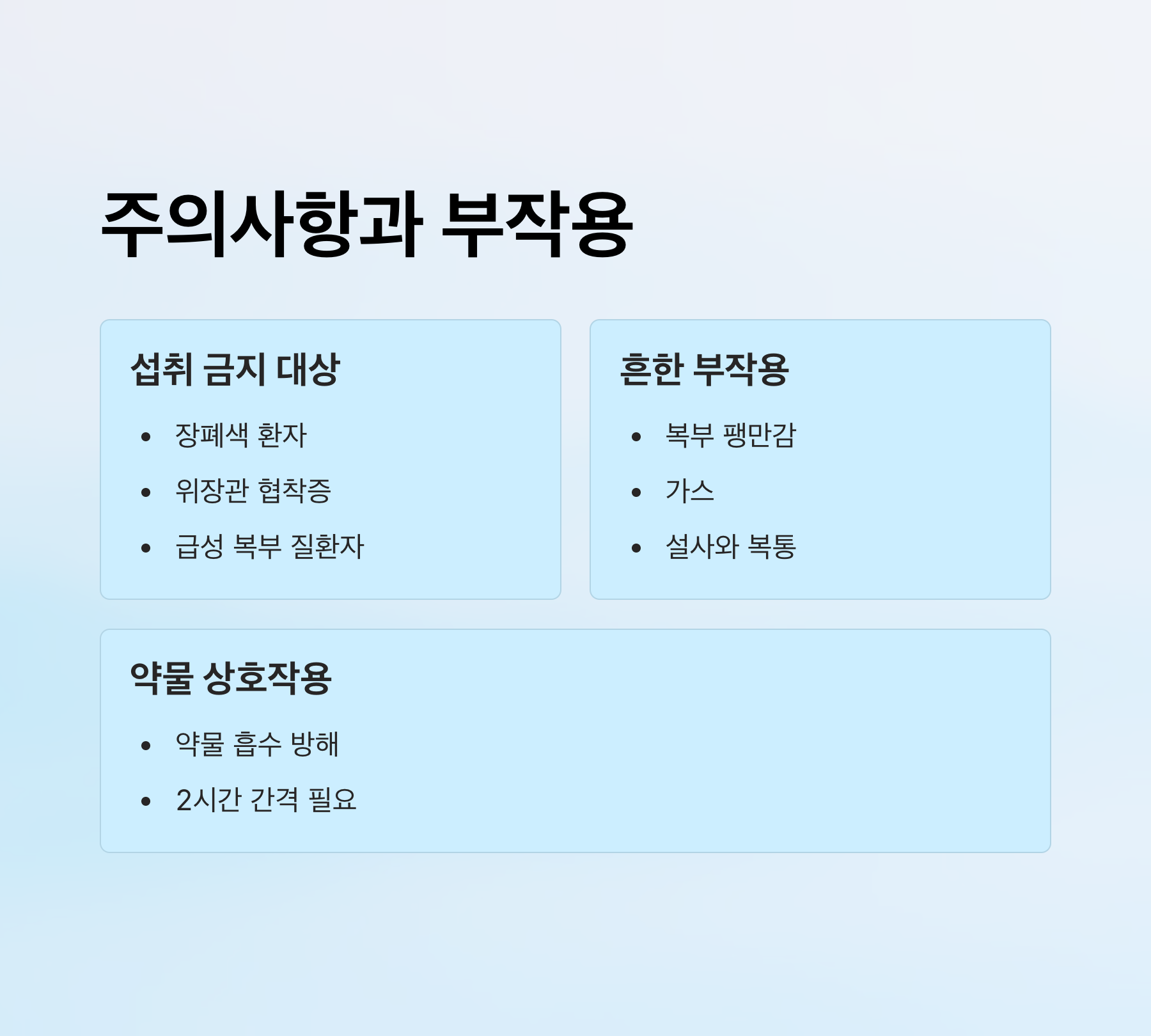 - 약물 흡수 방해 - 다른 약물과 함께 복용 시 흡수율이 감소할 수 있음