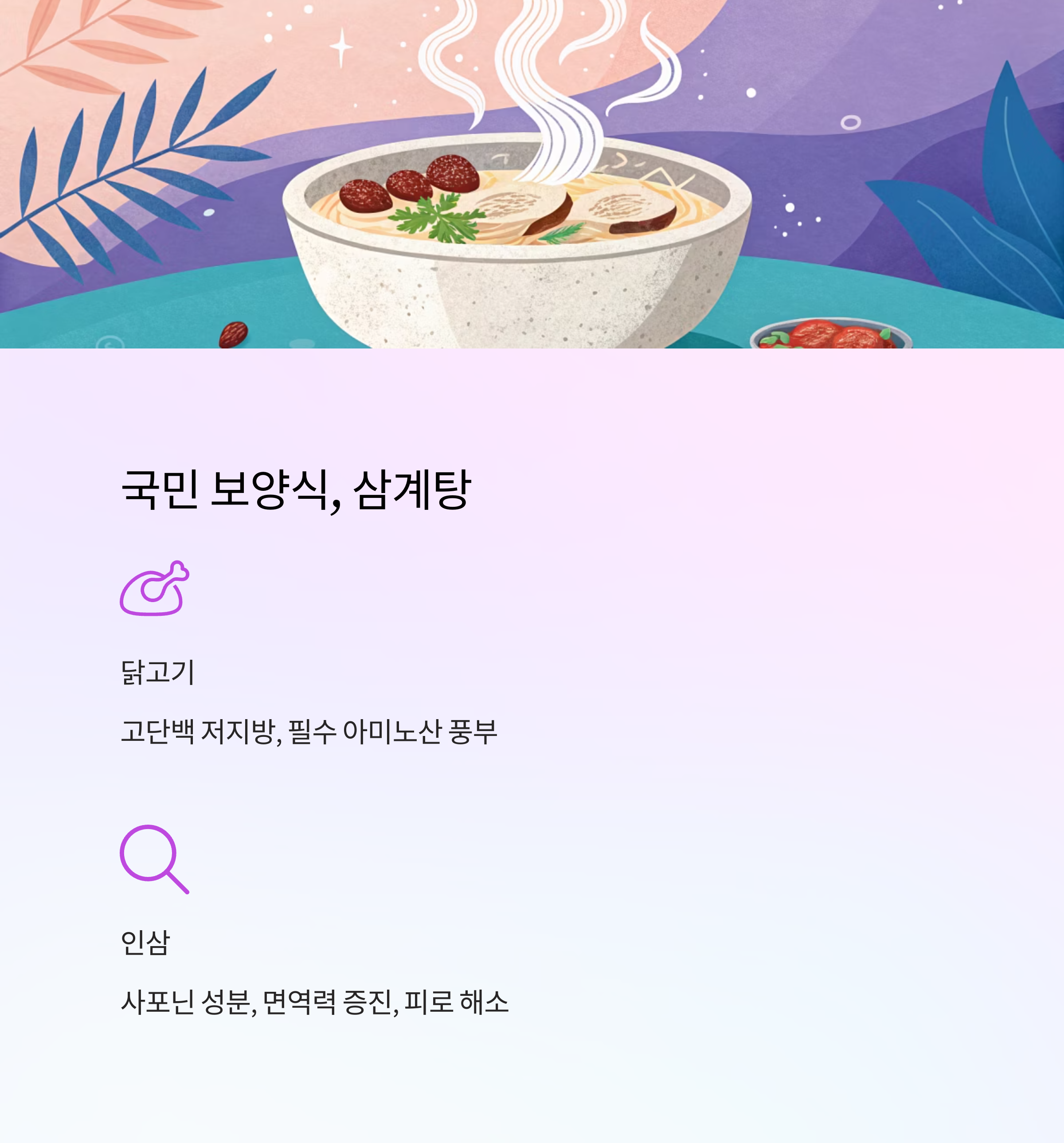 | 닭고기 | 고단백 저지방, 필수 아미노산 풍부, 원기 회복 |
