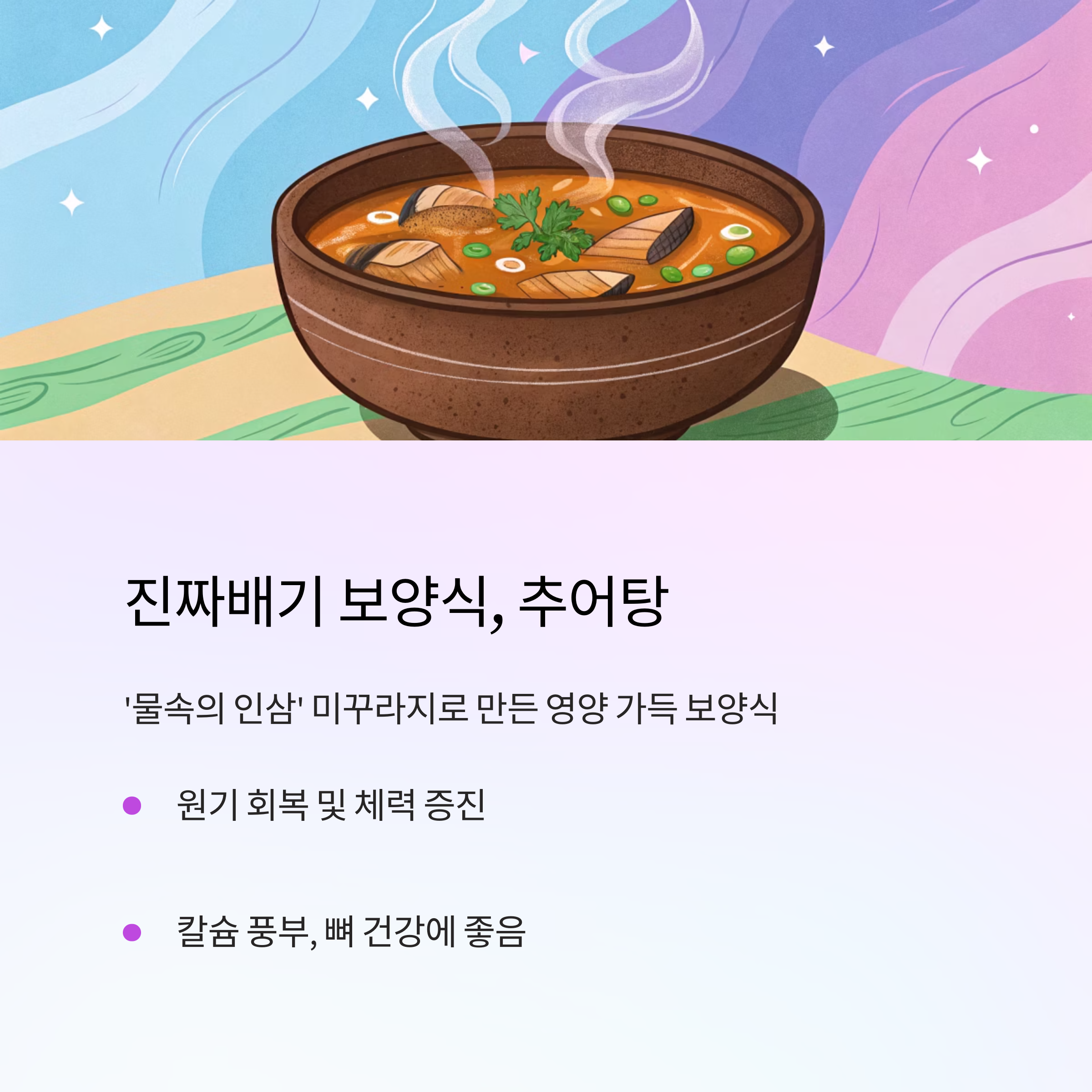 기름기가 적고 소화 흡수가 용이한 추어탕이 속 편한 보양식으로 안성맞춤입니다.