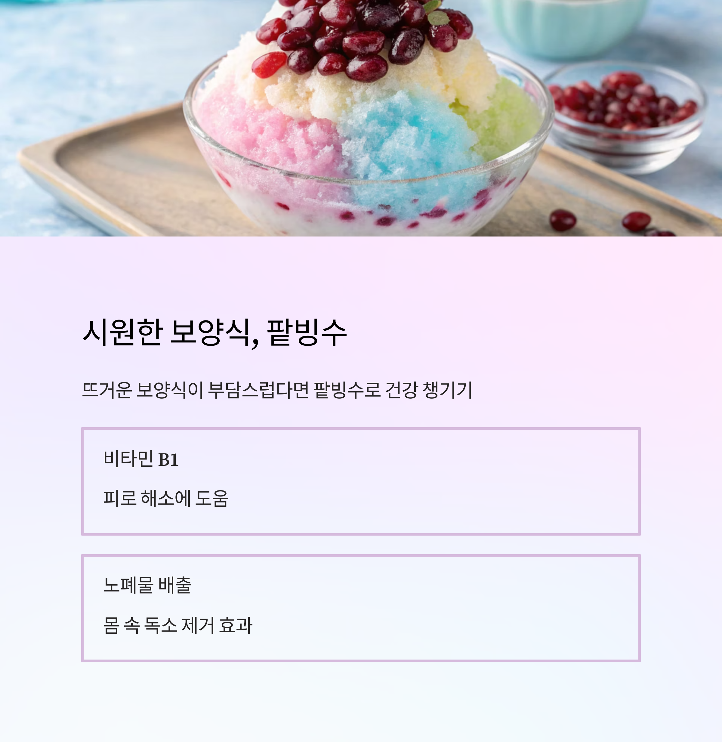 뜨거운 보양식이 영 부담스러운 분들도 계시죠? 저도 가끔은 그럴 때가 있거든요. 그럴 땐 시원~한 팥빙수가 의외의 복날 별미가 될 수 있어요. "에이, 빙수가 무슨 보양식이야?" 싶으시겠지만, 팥은 비타민 B1이 풍부해서 피로 해소에 도움을 주고, 몸속 노폐물을 배출하는 데도 효과적이랍니다. 얼음으로 몸의 열을 식혀주고, 달콤한 팥으로 기분 좋게 당 충전까지! 더위에 지쳐 입맛 없을 때 가볍게 즐기는 시원한 보양식으로 손색없겠죠?