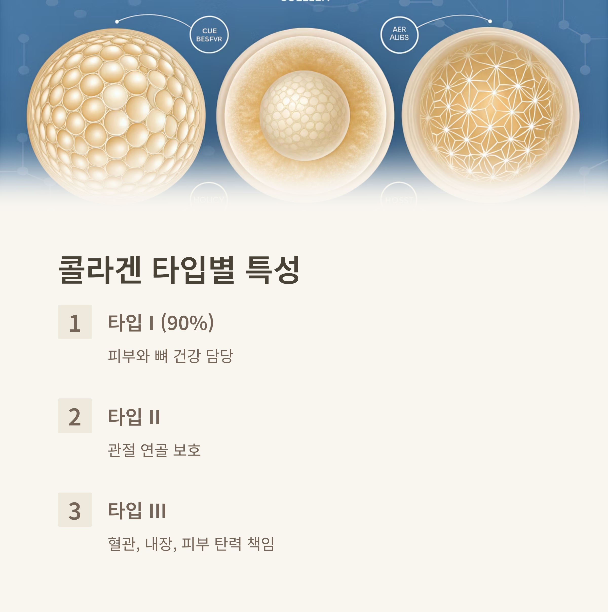 콜라겐이라고 해서 다 같은 콜라겐이 아니에요. 사실 우리 몸에는 28가지가 넘는 다양한 콜라겐이 있다는 거 아세요? 그중에서도 가장 중요한 건 타입 I, II, III인데... 각각 역할이 완전히 달라요. 마치 축구팀에서 골키퍼, 수비수, 공격수가 다른 역할을 하는 것처럼 말이죠.