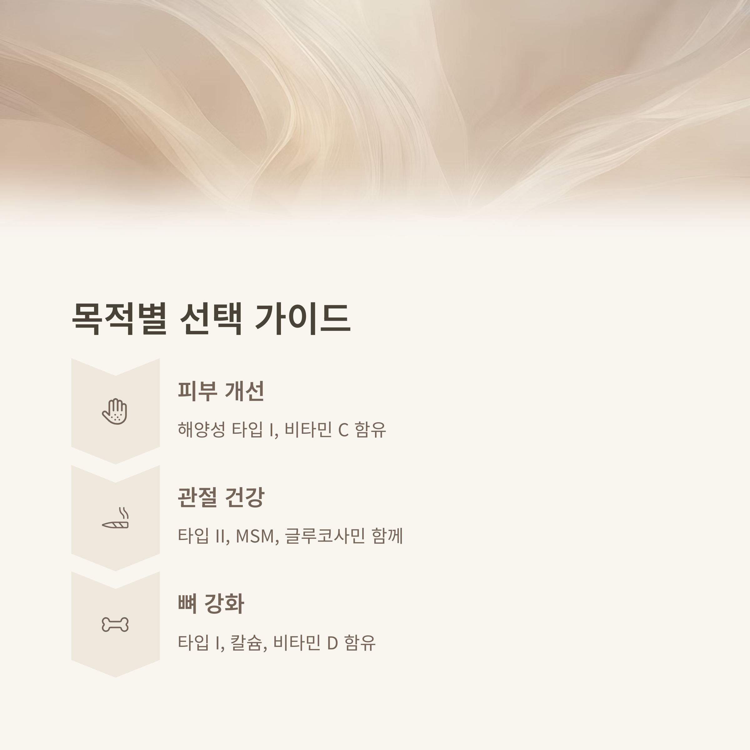 이제 정말 중요한 부분이에요. 콜라겐의 효과를 알았다고 해서 아무거나 사면 안 되거든요. 자신의 목적에 맞는 제품을 선택하는 게 핵심이에요. 제가 시행착오를 겪으며 정리한 가이드를 공유해드릴게요.