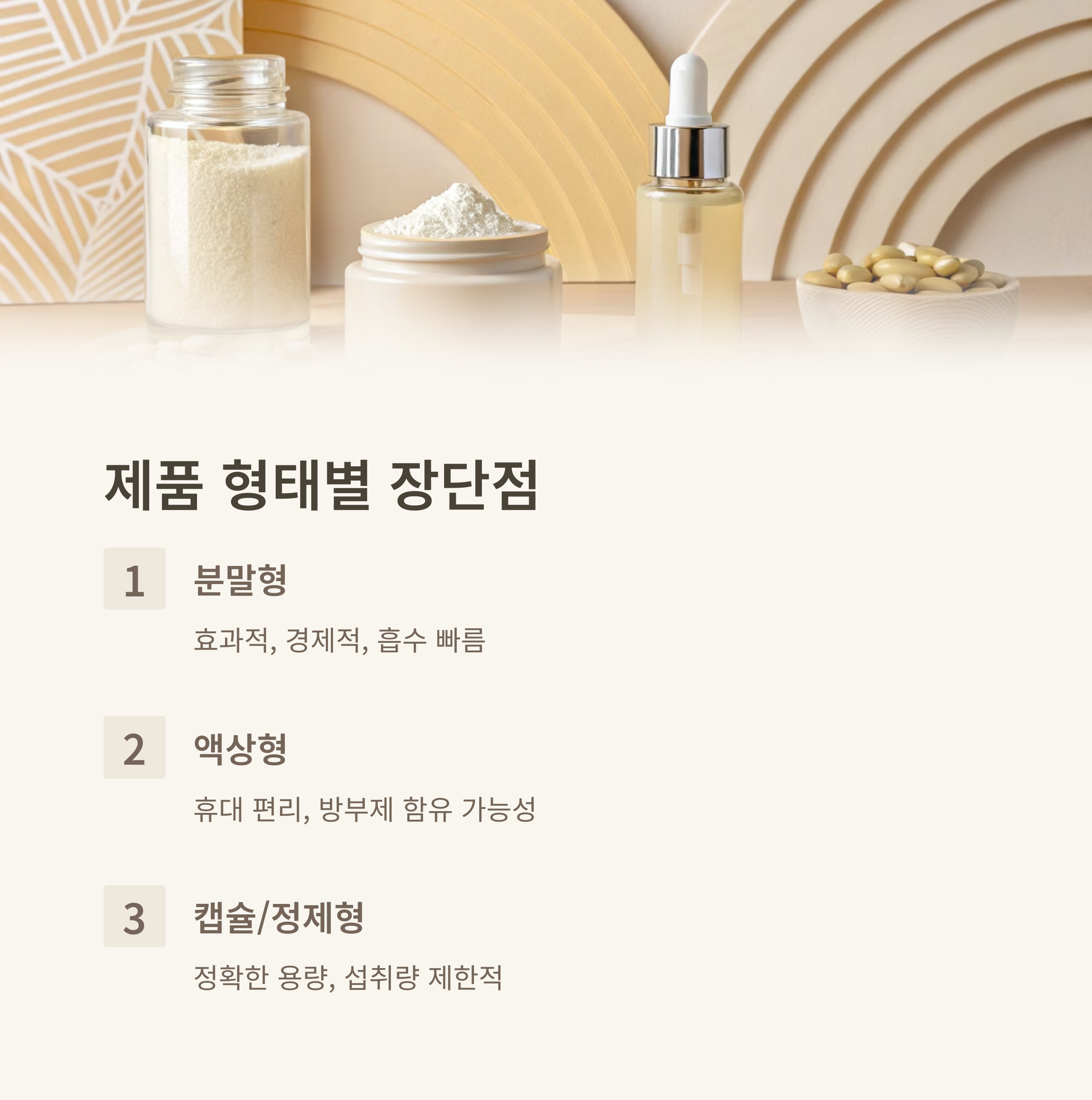 - 캡슐/정제형 - 맛이나 냄새에 민감한 분들에게 좋아요. 정확한 용량 조절이 가능하지만, 한 번에 섭취할 수 있는 콜라겐 양이 제한적이에요.