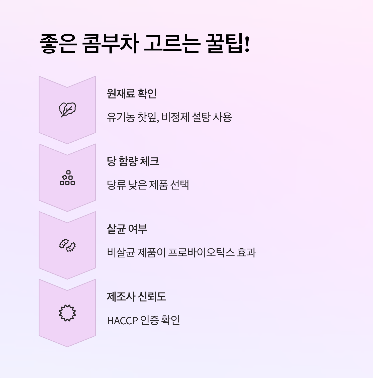 | 살균 여부 | 살균 처리된 콤부차는 유익균이 죽었을 가능성이 높아요. 프로바이오틱스 효과를 보려면 '비살균' 제품인지 확인하세요. |