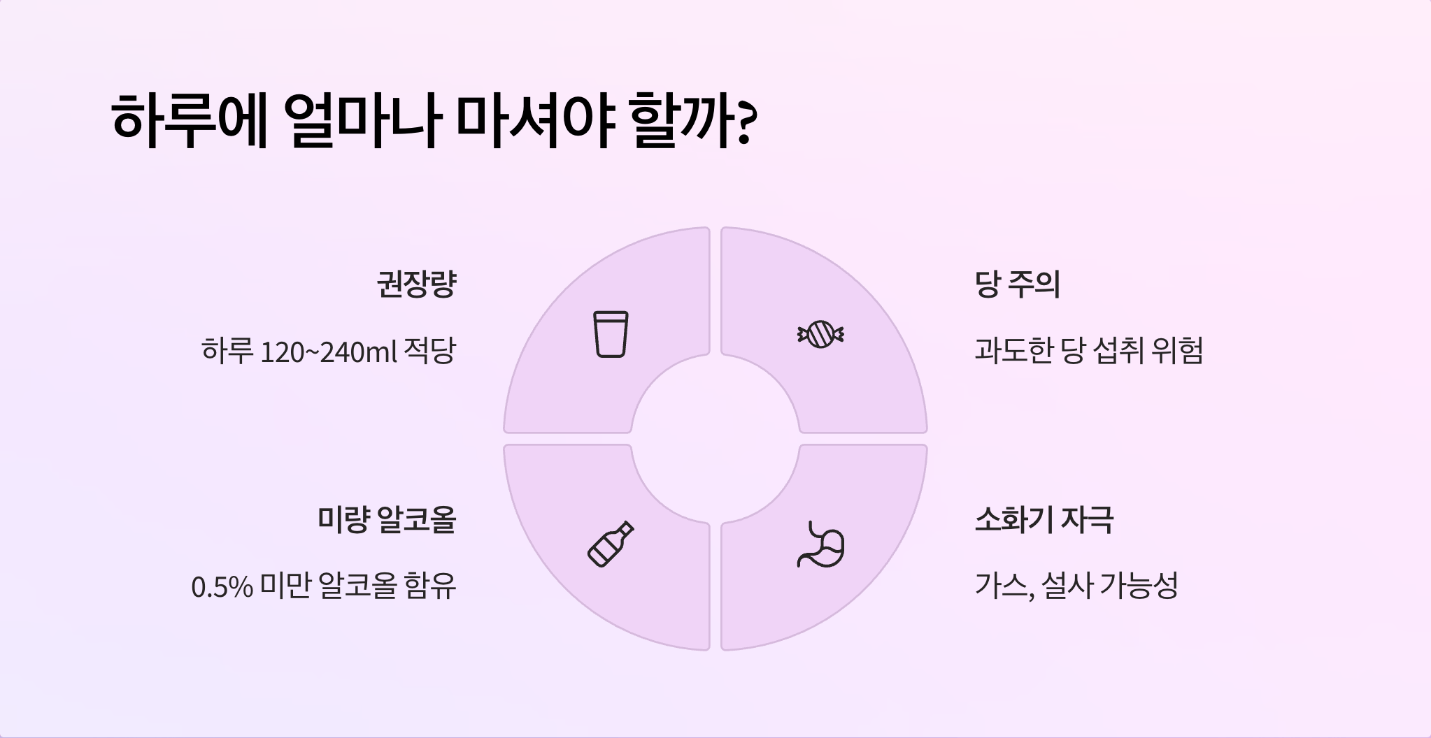 - 소량으로 시작하기: 처음에는 하루 100ml 이하로 시작해서 내 몸의 반응을 살피며 점차 양을 조절해 보세요.