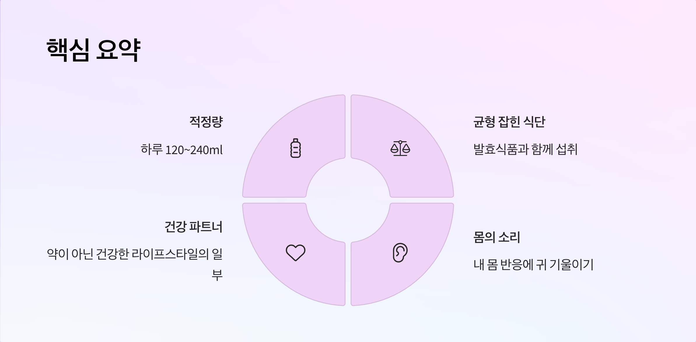 - 소량으로 시작하기: 처음에는 하루 100ml 이하로 시작해서 내 몸의 반응을 살피며 점차 양을 조절해 보세요.