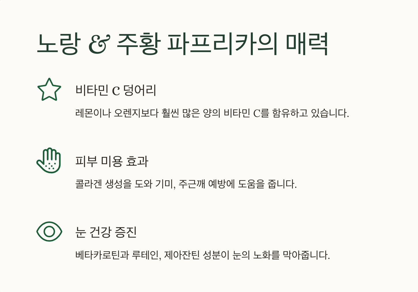 초록색을 벗어나 예쁜 노란색과 주황색 옷으로 갈아입은 파프리카는 그야말로 '비타민 C 덩어리'라고 할 수 있습니다. 레몬이나 오렌지보다도 훨씬 많은 양의 비타민 C를 품고 있어서 스트레스 해소와 피로 회복, 피부 미용에 탁월한 효과를 보이죠. 특히 주황색 파프리카는 베타카로틴 함량도 높아지기 시작하는데, 이 성분은 우리 몸에서 비타민 A로 변신해 눈 건강과 면역력을 지켜주는 든든한 지원군이랍니다.