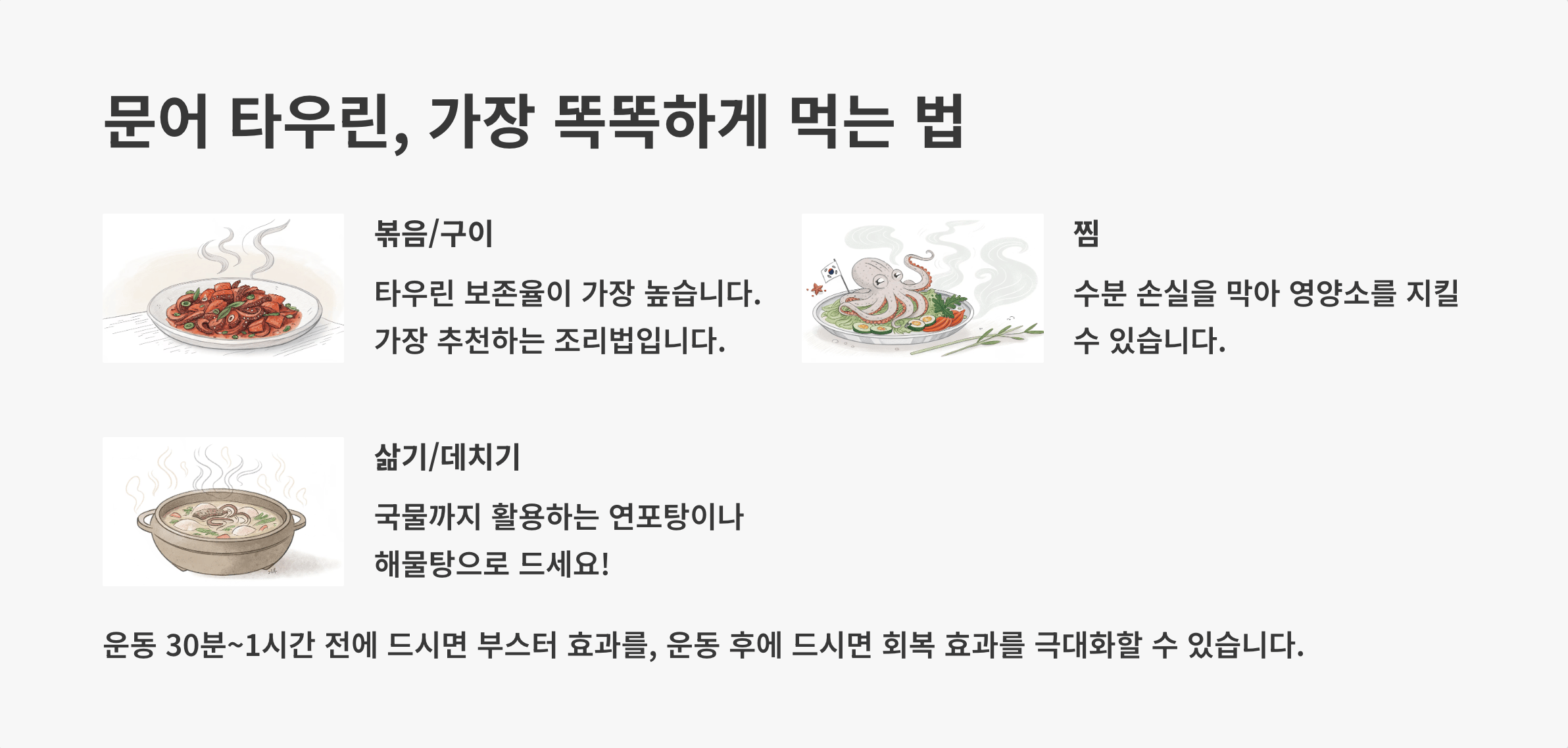 | 조리법 | 타우린 보존율 | 꿀팁 (Tip) |