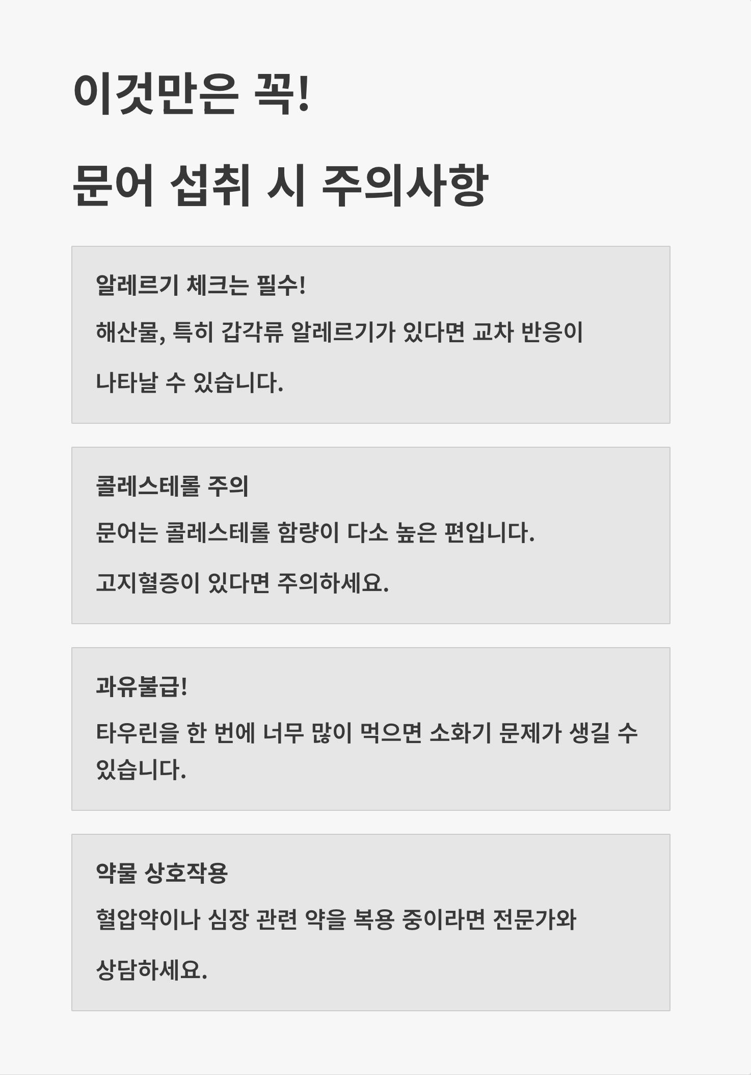 몸에 좋다고 무작정 많이 먹는 건 금물! 뭐든지 과유불급이죠. 특히 저처럼 여러 만성질환을 관리해야 하는 입장에서는 더더욱 조심해야 합니다. 문어를 드시기 전에 아래 4가지는 꼭 기억해주세요.