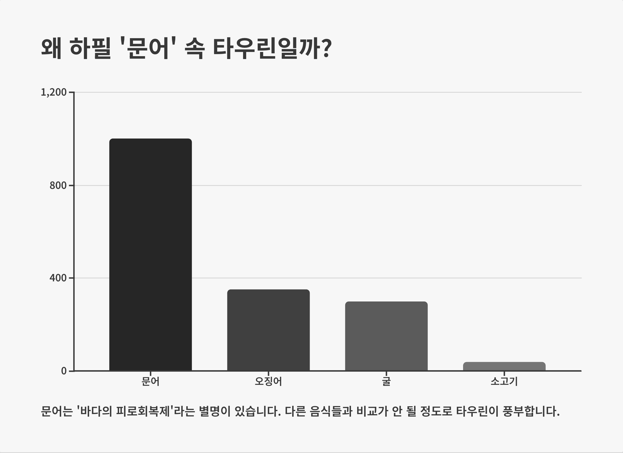 그럼 많고 많은 음식 중에 왜 다들 '문어'를 이야기할까요? 정답은 압도적인 함량에 있습니다. 문어는 '바다의 피로회복제'라는 별명이 그냥 붙은 게 아니에요. 아래 표를 보시면 바로 이해가 되실 겁니다. 다른 음식들과는 비교가 안 될 정도로 타우린이 풍부하죠. 문어 100g만 먹어도 하루 권장량을 거뜬히 채울 수 있을 정도니까요. 이 풍부한 타우린 덕분에 문어는 지치지 않고 바닷속을 헤엄쳐 다닐 수 있는 거랍니다. 우리도 문어의 이 강력한 에너지를 빌려보는 건 어떨까요?