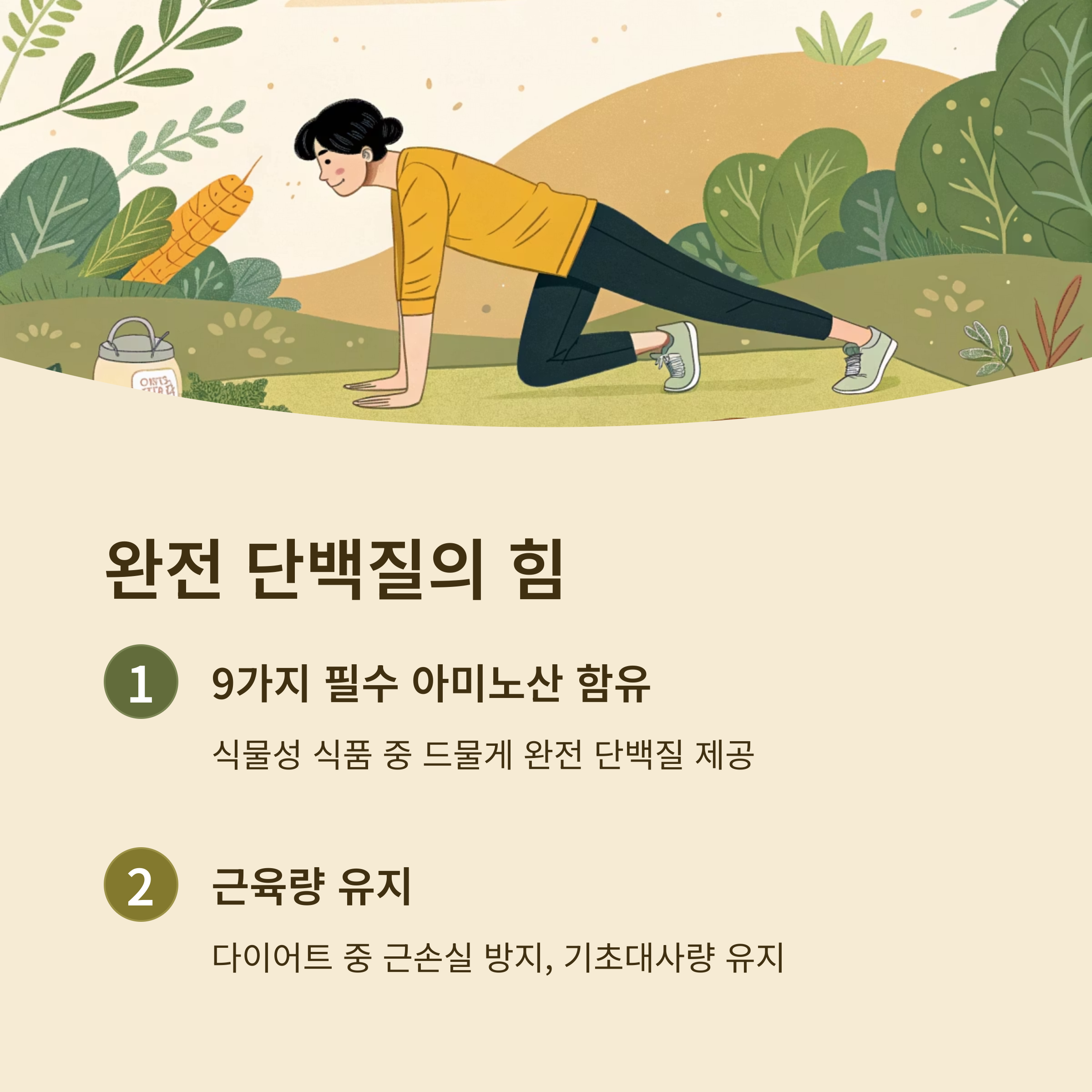 | 완전 단백질 | 근육량 유지 및 기초대사량 저하 방지, 운동 후 근육 회복 지원 |