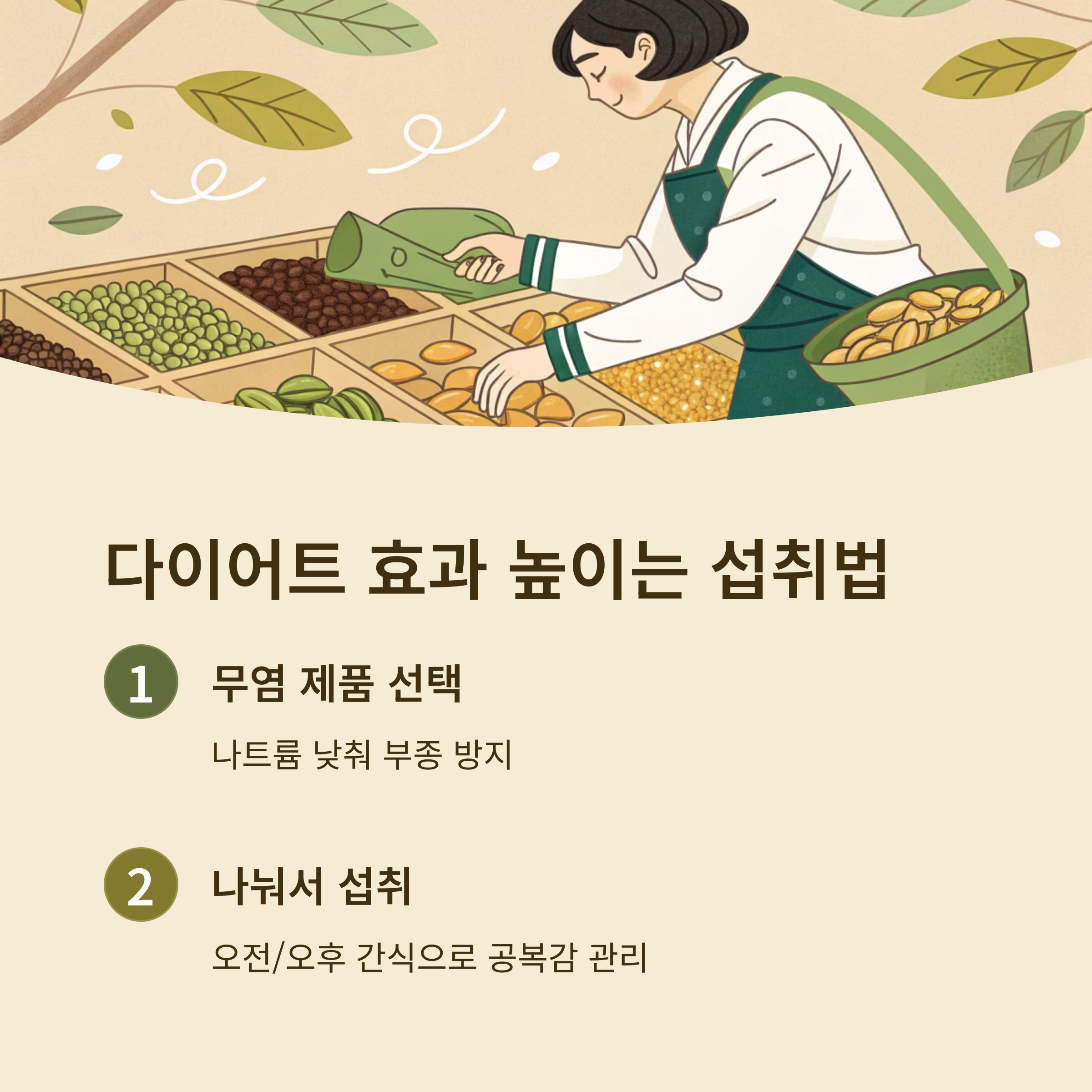 | 나눠서 섭취하기 | 하루 권장량을 오전과 오후 간식 시간으로 나눠 섭취하면 공복감을 효과적으로 관리하고 폭식을 예방할 수 있습니다. |