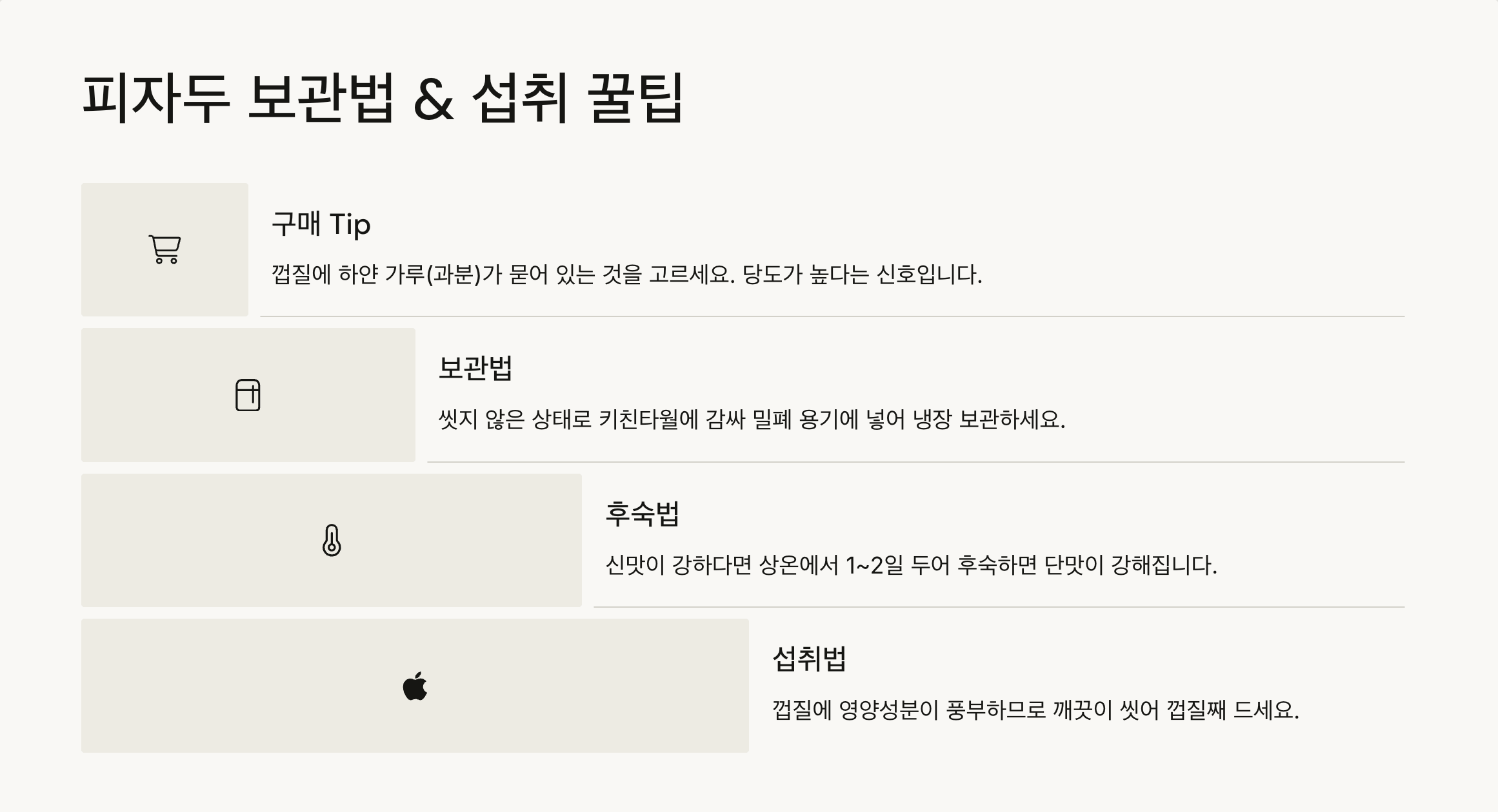 | 후숙법 | 신맛이 강하다면 상온에서 1~2일 두어 후숙하면 단맛이 강해집니다. |