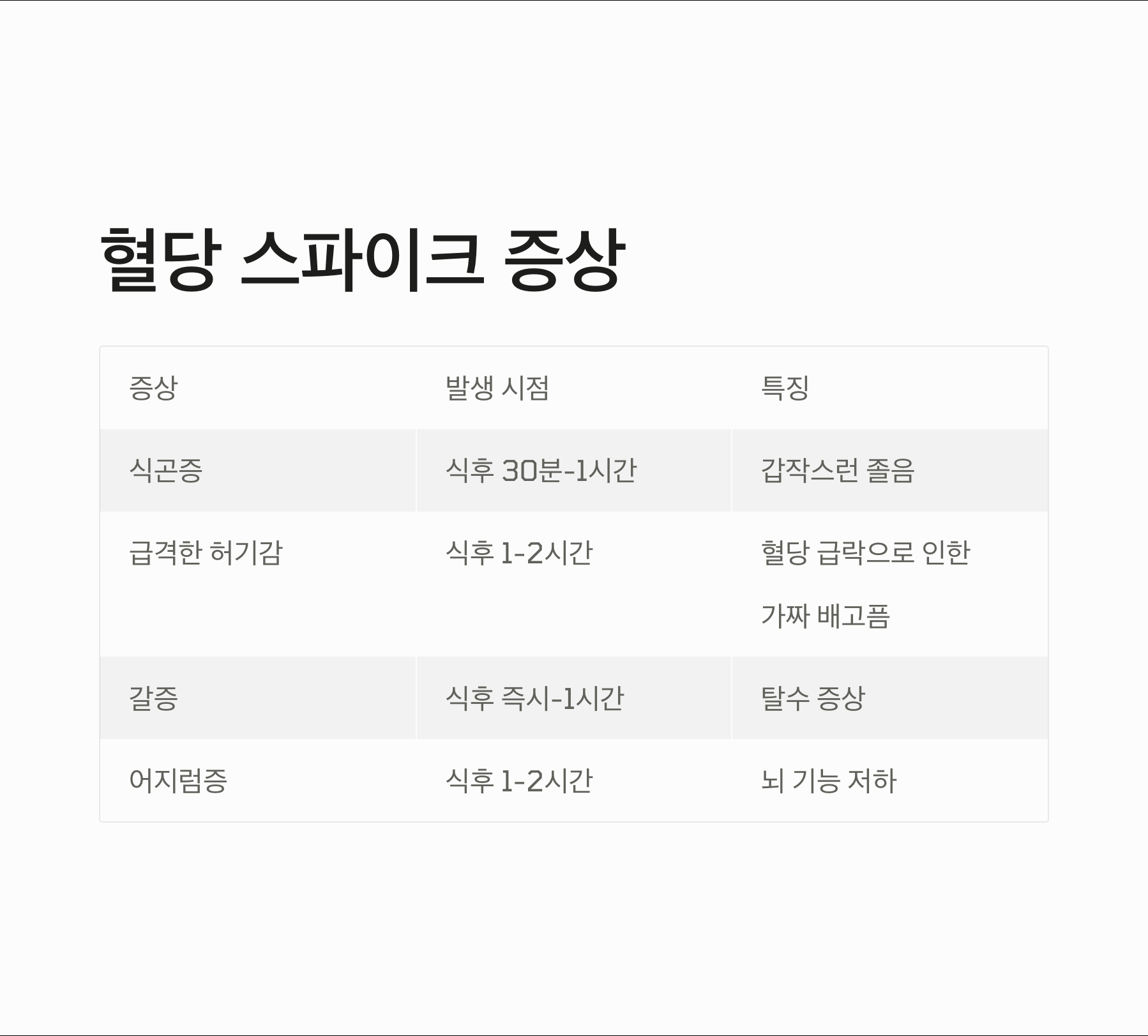 아, 이 부분은 정말 제 이야기 같아요. 예전에 점심 먹고 나면 항상 졸리고 집중이 안 되는 거예요. 처음엔 그냥 나이 때문인 줄 알았는데... 알고 보니 혈당 스파이크 때문이었더라고요. 혈당 스파이크의 대표적인 증상들을 표로 정리해봤어요.