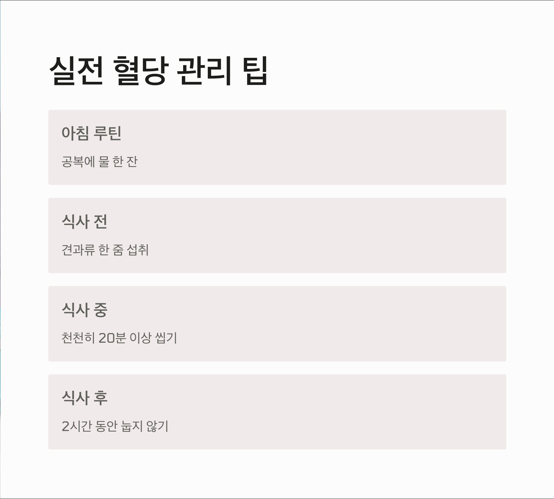 💡 실전 팁: 외식할 때도 반찬부터 먹고 밥을 나중에 드세요. 특히 회식 자리에서 술 마시기 전에 채소를 충분히 먹으면 혈당 급상승을 막을 수 있어요!